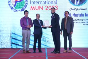 𝐏𝐫𝐞𝐬𝐒𝐝𝐞𝐧𝐜𝐲 𝐈𝐧𝐭𝐞𝐫𝐧𝐚𝐭𝐒𝐨𝐧𝐚π₯ πŒπ”π πŸπŸŽπŸπŸ‘   The esteemed Presidency International MUN Conference 2023 concluded with an impressive closing ceremony where 44 delegates from 9 committees were awarded. The event was presided over by Dr. Imam Hasan Reza, Rector, Presidency Education and featured Mr. Mohammed Mizanur Rahman, Refugee Relief and Repatriation Commissioner, Cox’s Bazar and Additional Secretary of the Ministry of Disaster Management and Relief, as the distinguished Chief Guest, who eloquently emphasized the pivotal role of the younger generation in addressing complex challenges, including the Rohingya refugee crisis and climate change. He urged the attending delegates to prepare for leadership roles in national development. Marisa Maclennan, a special guest, stressed the paramount importance of cooperation and collaboration, core principles of the United Nations, while Mr. N. Mostafa Tarek, Deputy Managing Director of United Commercial Bank (PLC), offered wise counsel on nurturing dreams and determination for personal achievement. Distinguished attendance from Academic Management included Mr. Ashraful Haque Khan Swapon, Chairman, Mr. Golzar Alam Alamgir, Member Secretary, among others.
